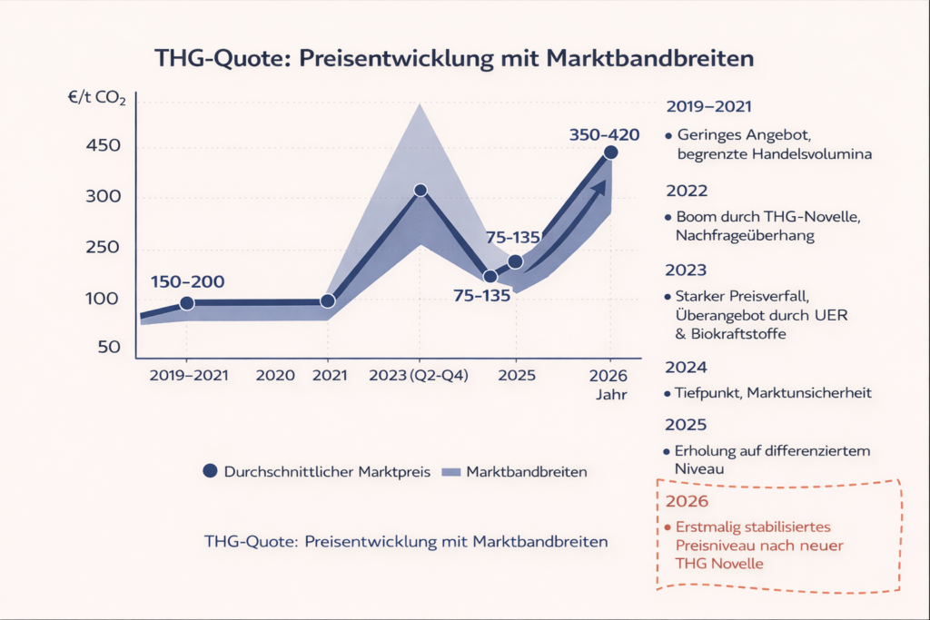 | 2026 | 350-420€/t CO₂ | Erstmalig stabilisiertes Preisniveau nach neuer THG Novelle |
